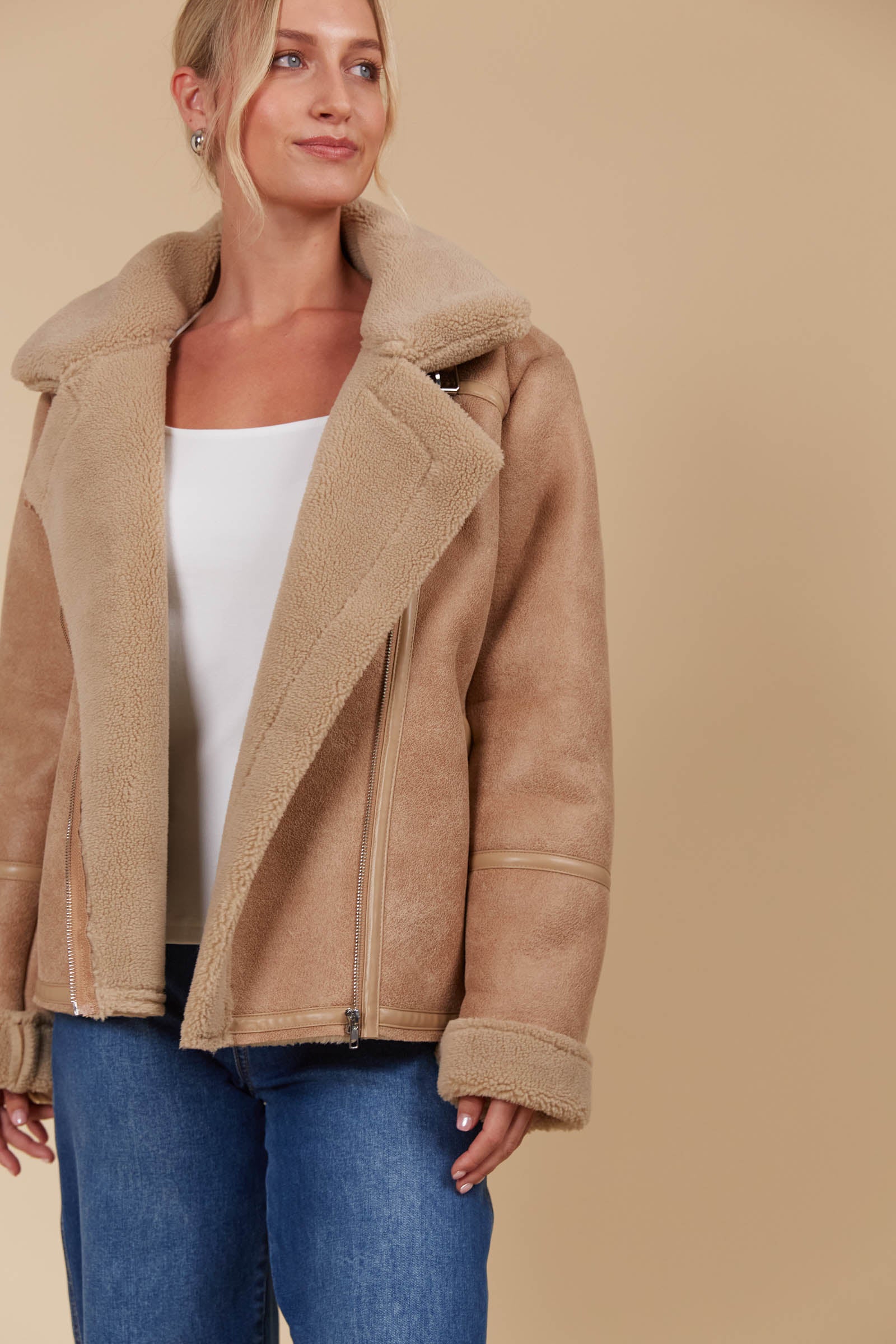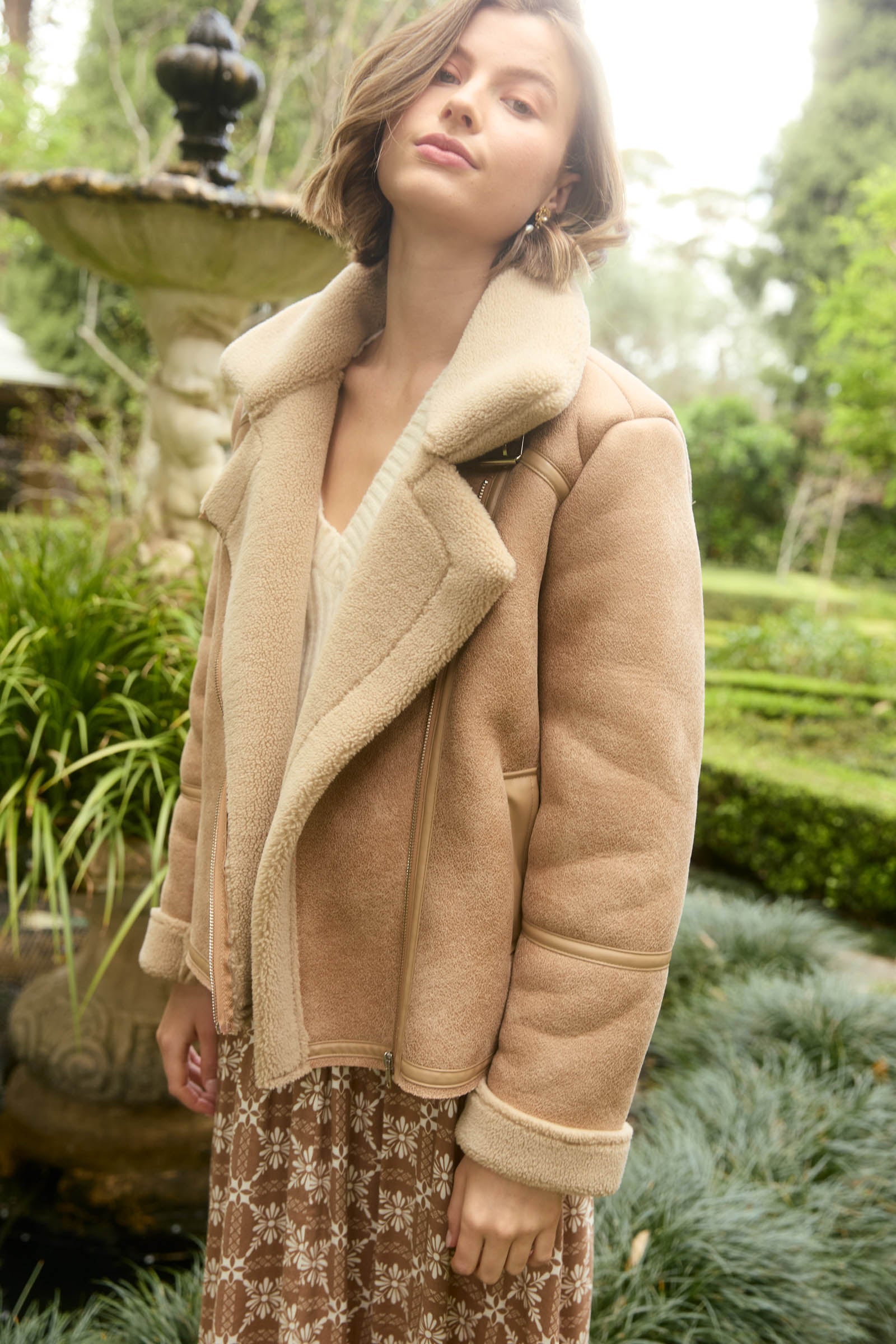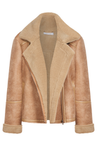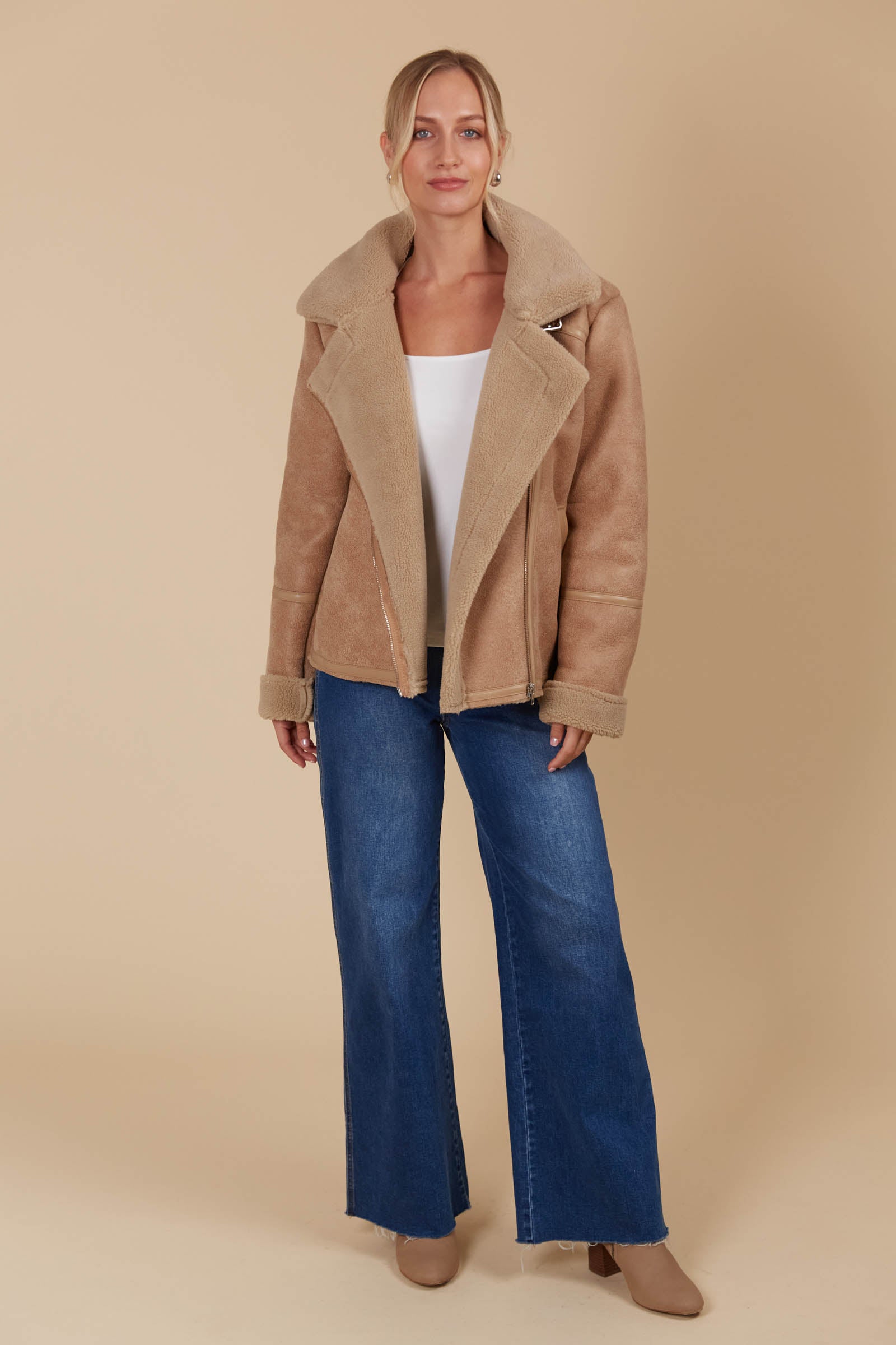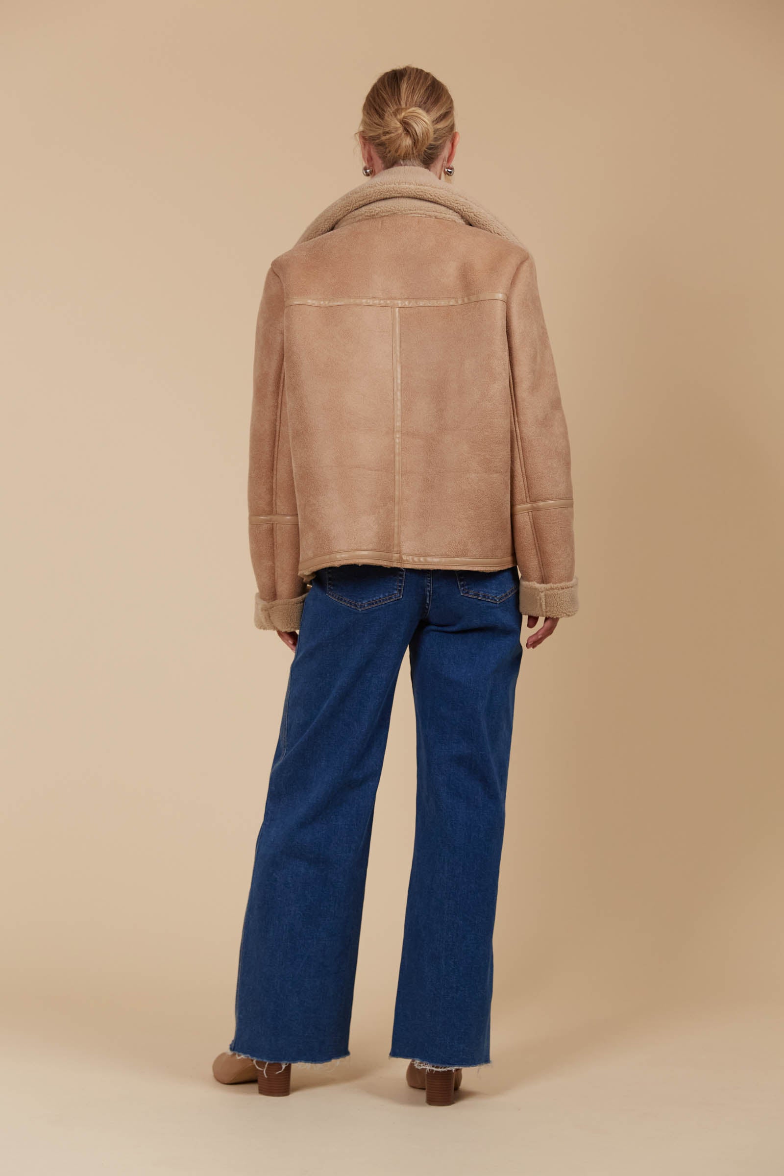 The Eris Jacket embodies classic winter style with its cosy shearling lining that extends from the lapels to the cuffs for additional warmth. The zipper closure adds an extra layer of protection against chilly weather. Perfect for icy winter days, this jacket pairs beautifully over a knit top, maxi skirt, or jeans and boots for a chic winter look.