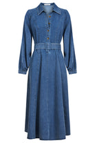 A true wardrobe essential, the Freya Dress offers a luxurious texture and a midi-length that can be styled in many ways. With a collar, a popover placket, and a removable self-fabric belt that shapes the figure, this dress exudes classic charm. Style it with gold accents and suede boots for a sophisticated finish, or opt for a kitten heel to add a touch of elegance to the look.