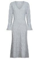 Made from a wool and recycled polyester knit weave, the Hera Knit Dress offers understated beauty. Its key features include a V-neck opening, a flared mermaid skirt, and a distinctive textured weave that adds depth to the design. Perfect for layering beneath outerwear, this midi dress is a versatile option for the office, an evening out, or any special event.