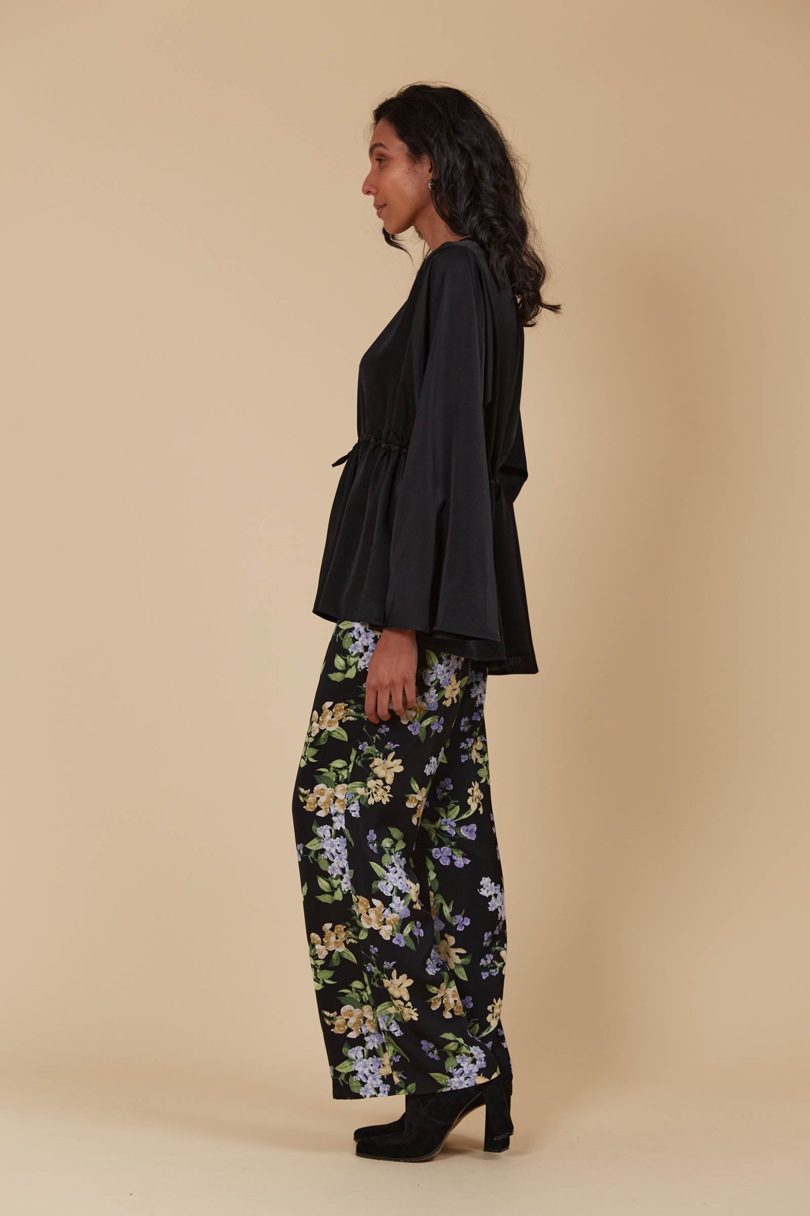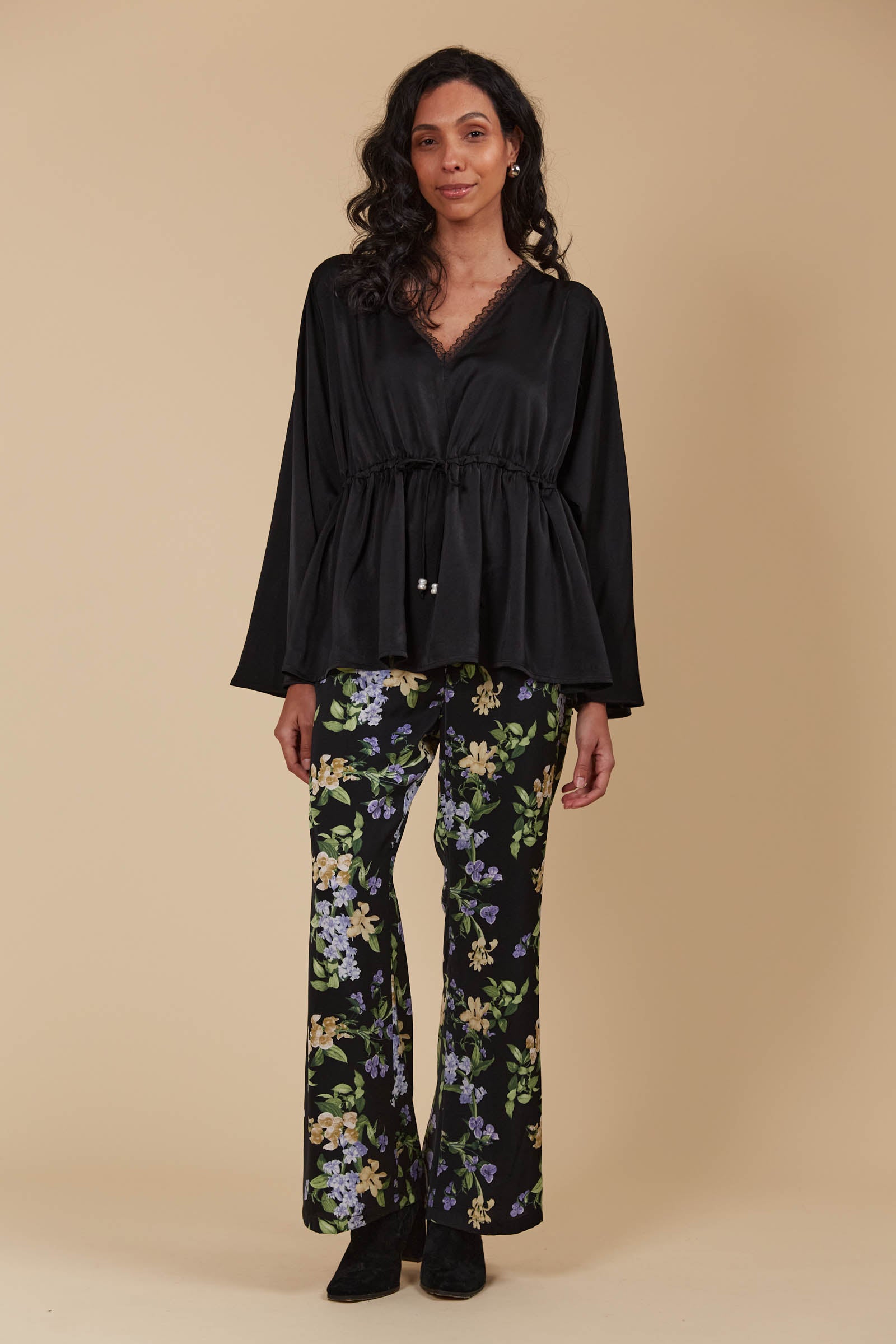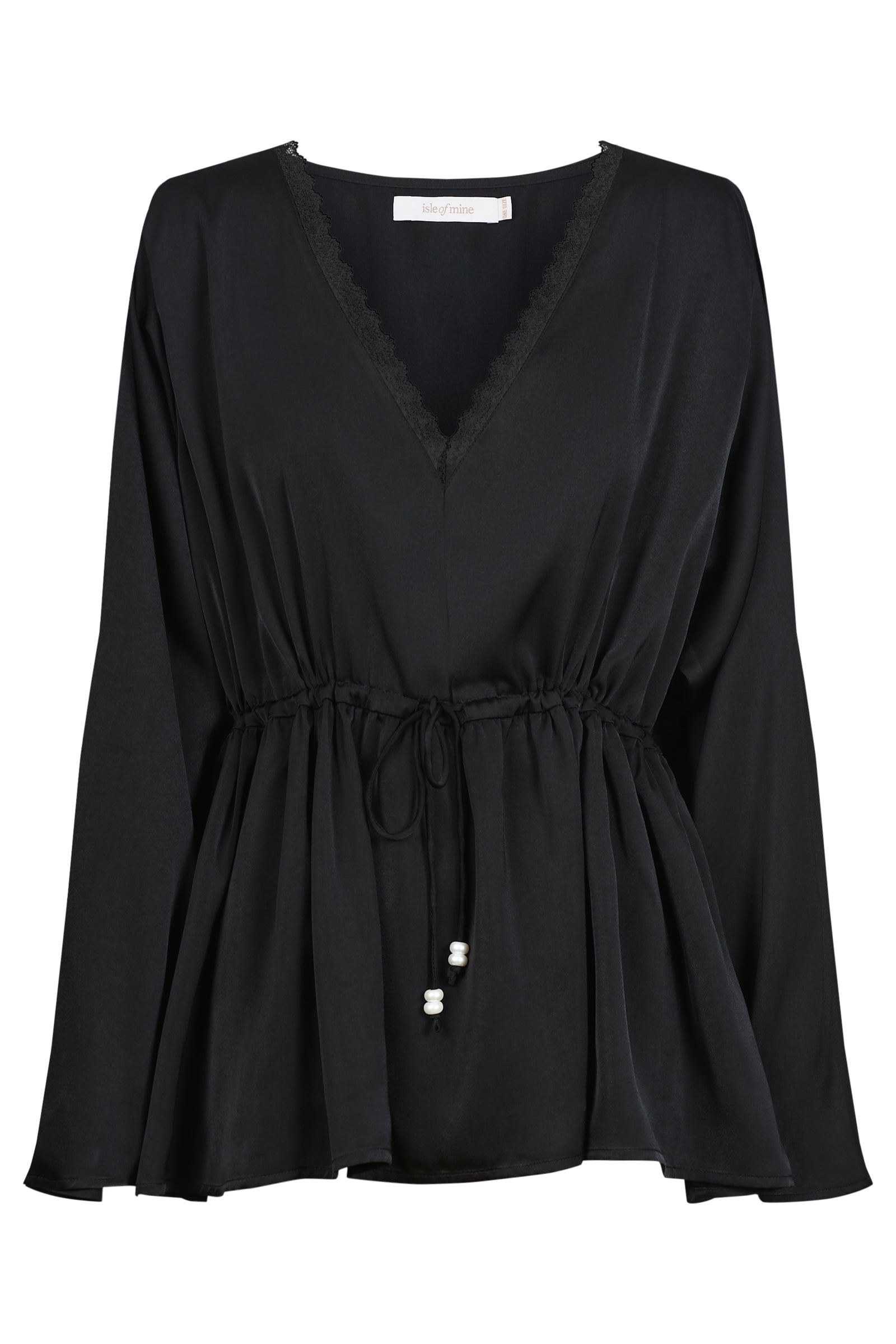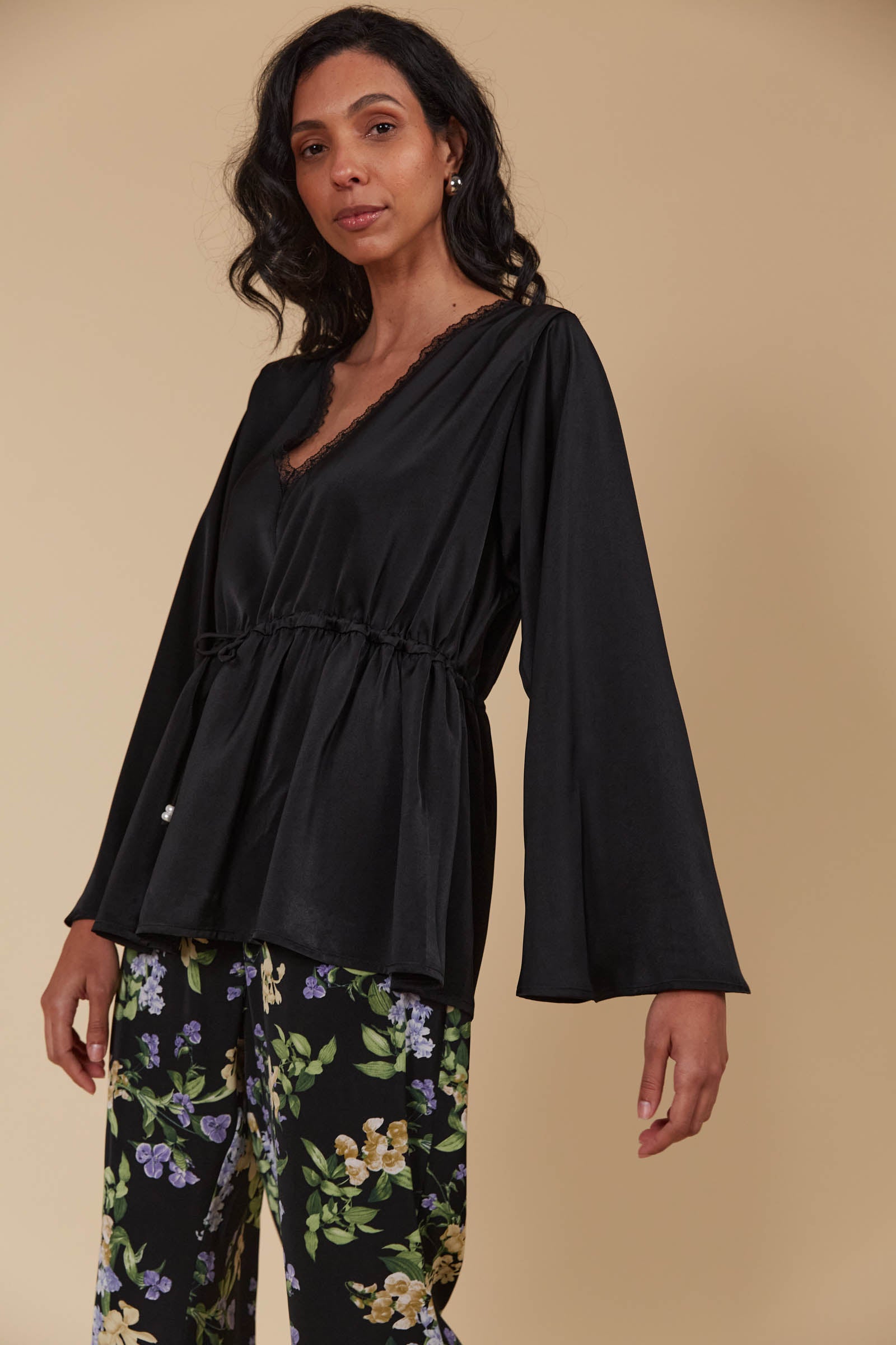 Crafted with a silky smooth texture, the Maia Relaxed Top is a chic staple for your winter wardrobe. Its graceful V-neckline, adorned with lace trim, and flowing bell sleeves lends a touch of elegance. The adjustable drawstring waist offers a custom fit that accentuates your shape beautifully. Perfect for an evening dinner or a stylish gathering, the Maia Relaxed Top pairs seamlessly with tailored trousers for a polished, timeless ensemble.