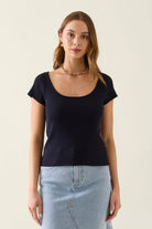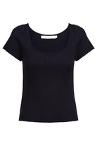 This wardrobe essential features a soft ribbed knit, scoop neckline, and cap sleeves. The slightly flared shape offers a flattering, comfortable summer silhouette.