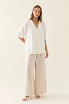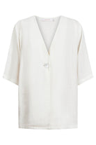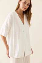 A refined linen-blend blouse with a clean V-neckline and mid-length sleeves for added coverage. Features a single front button fastening and a straight hemline for versatile wear.