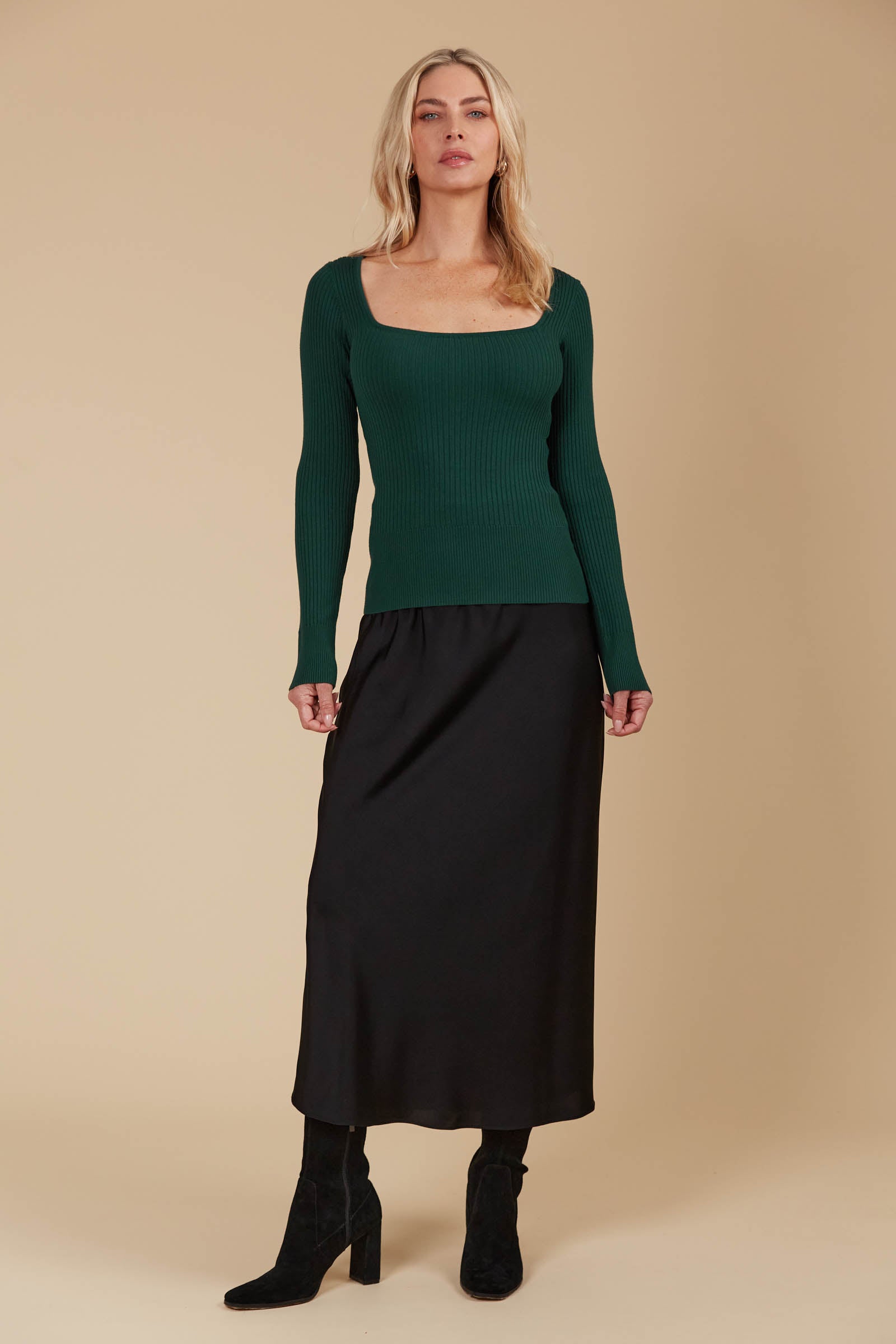 Chic and feminine, the Juno Square Neck Top is a perfect choice for evenings out. The flattering square neckline highlights your décolletage, while the semi-fitted design contours your figure beautifully. Ideal for cooler winter nights, its ribbed knit weave provides warmth and comfort. Pair it with a silky midi skirt, metallic accessories, heels, and a coat for a stylish evening look.