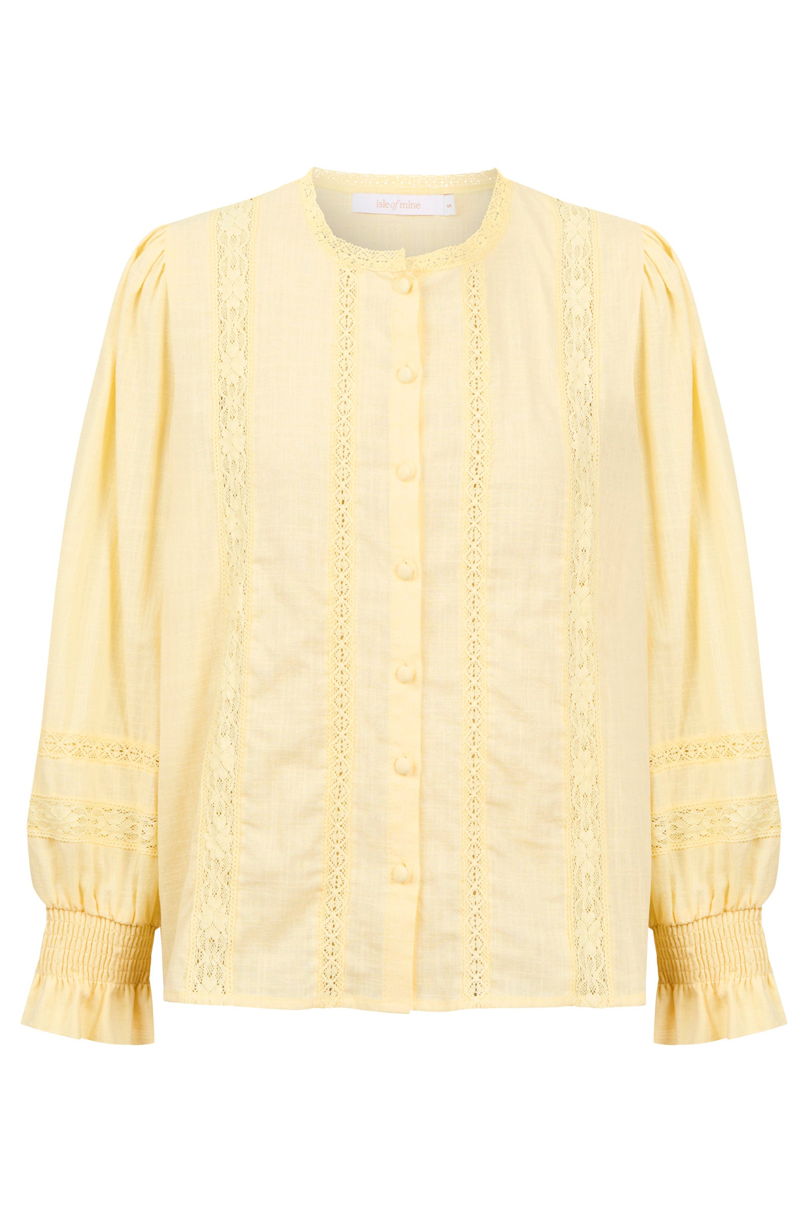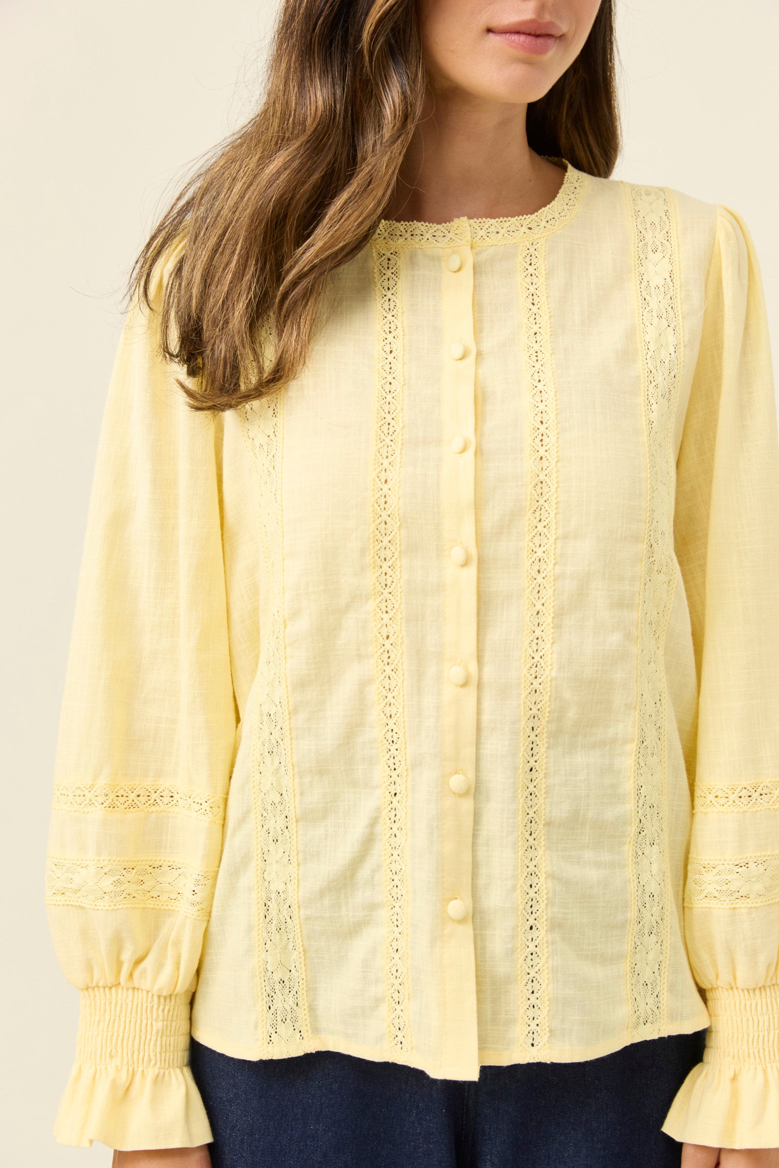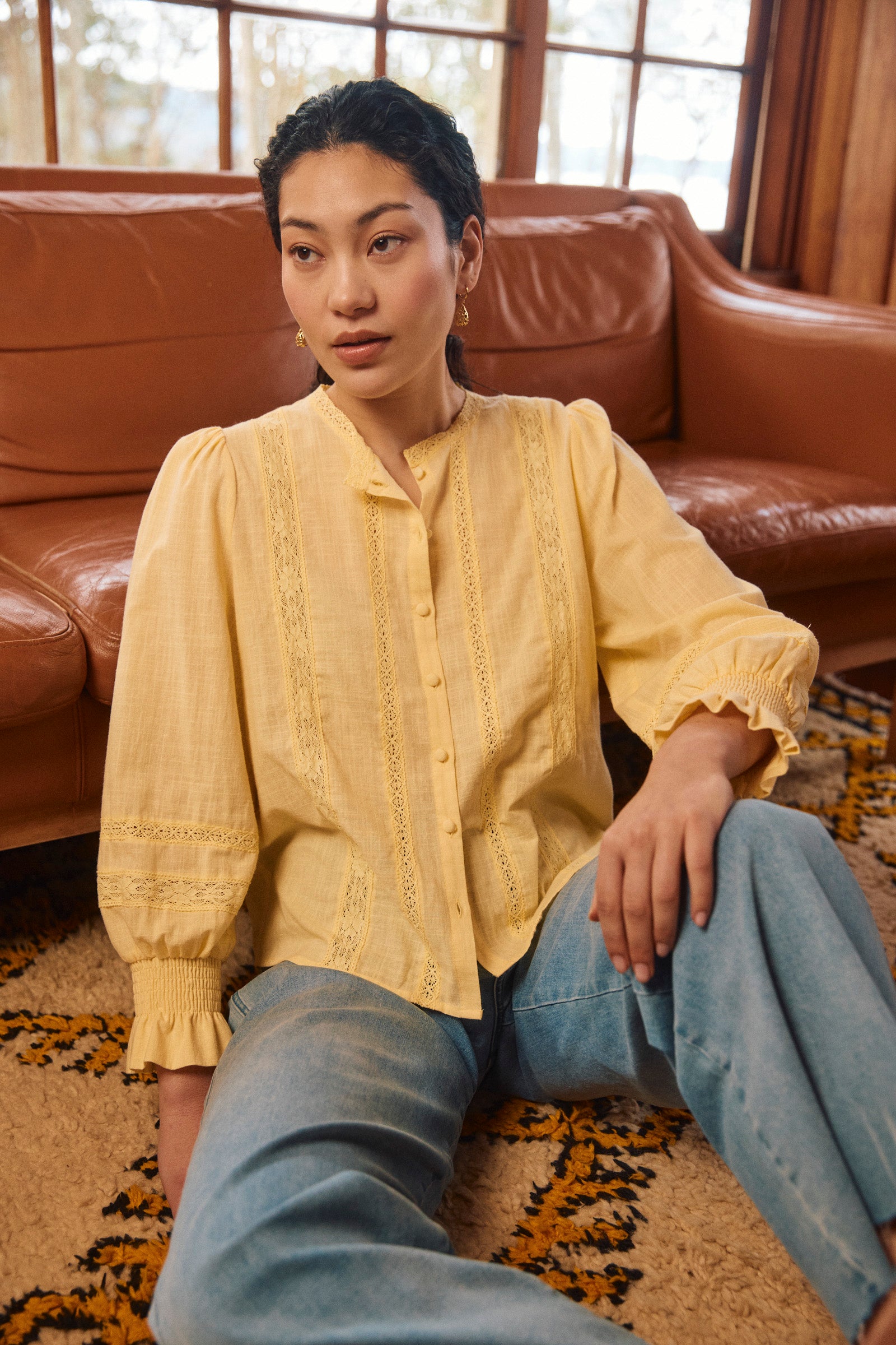 A feminine, lightweight cotton shirt with thoughtful detail, the Maeve Shirt blends soft structure with delicate lace accents. The band collar and lace inserts create a refined texture, complemented by full sleeves that gather at the shirred cuffs for gentle volume.
