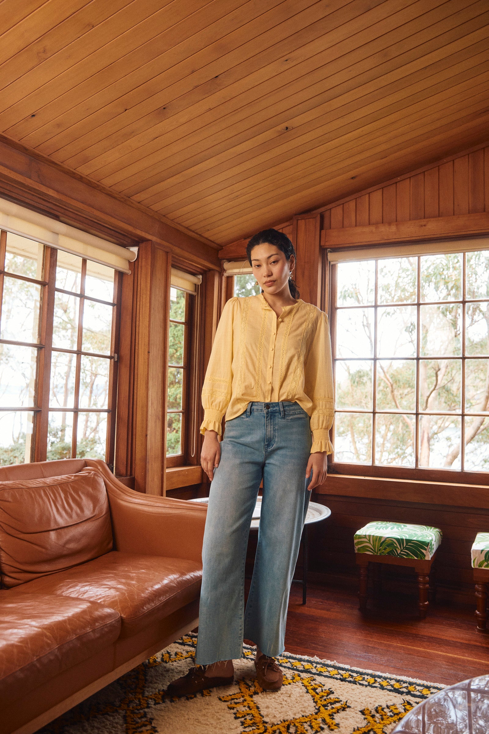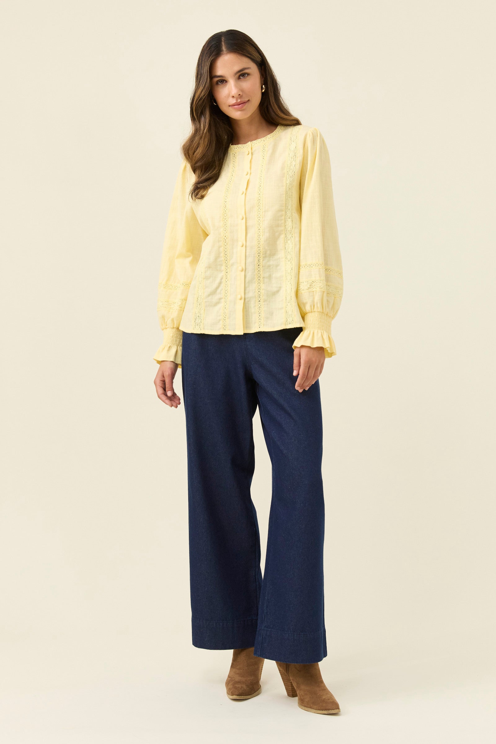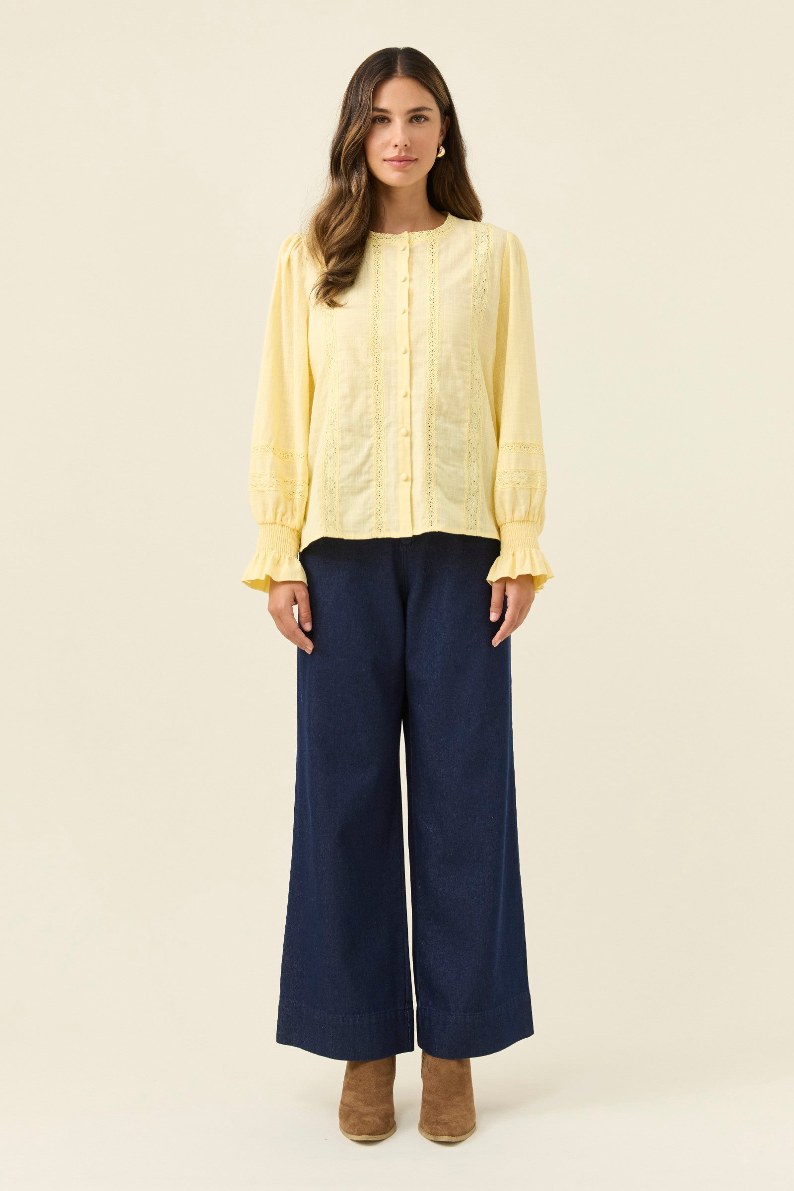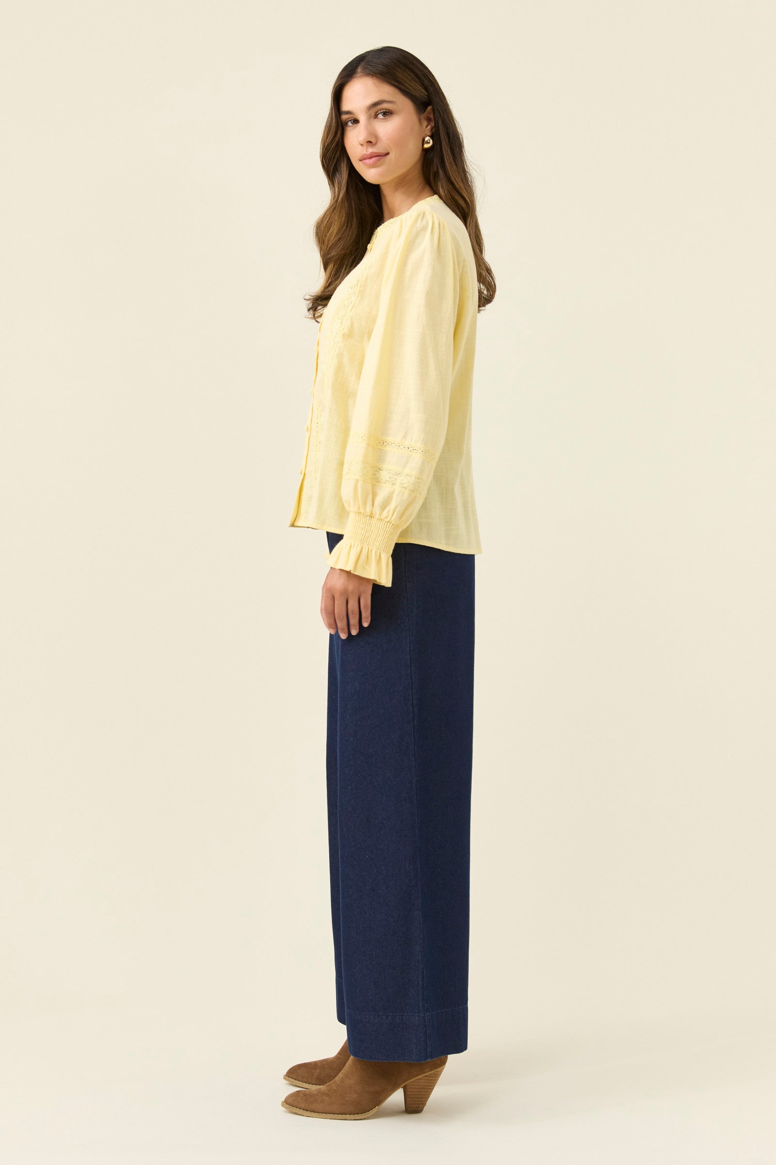 A feminine, lightweight cotton shirt with thoughtful detail, the Maeve Shirt blends soft structure with delicate lace accents. The band collar and lace inserts create a refined texture, complemented by full sleeves that gather at the shirred cuffs for gentle volume.