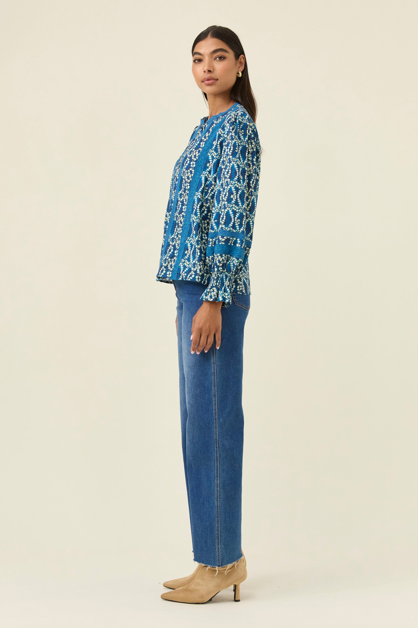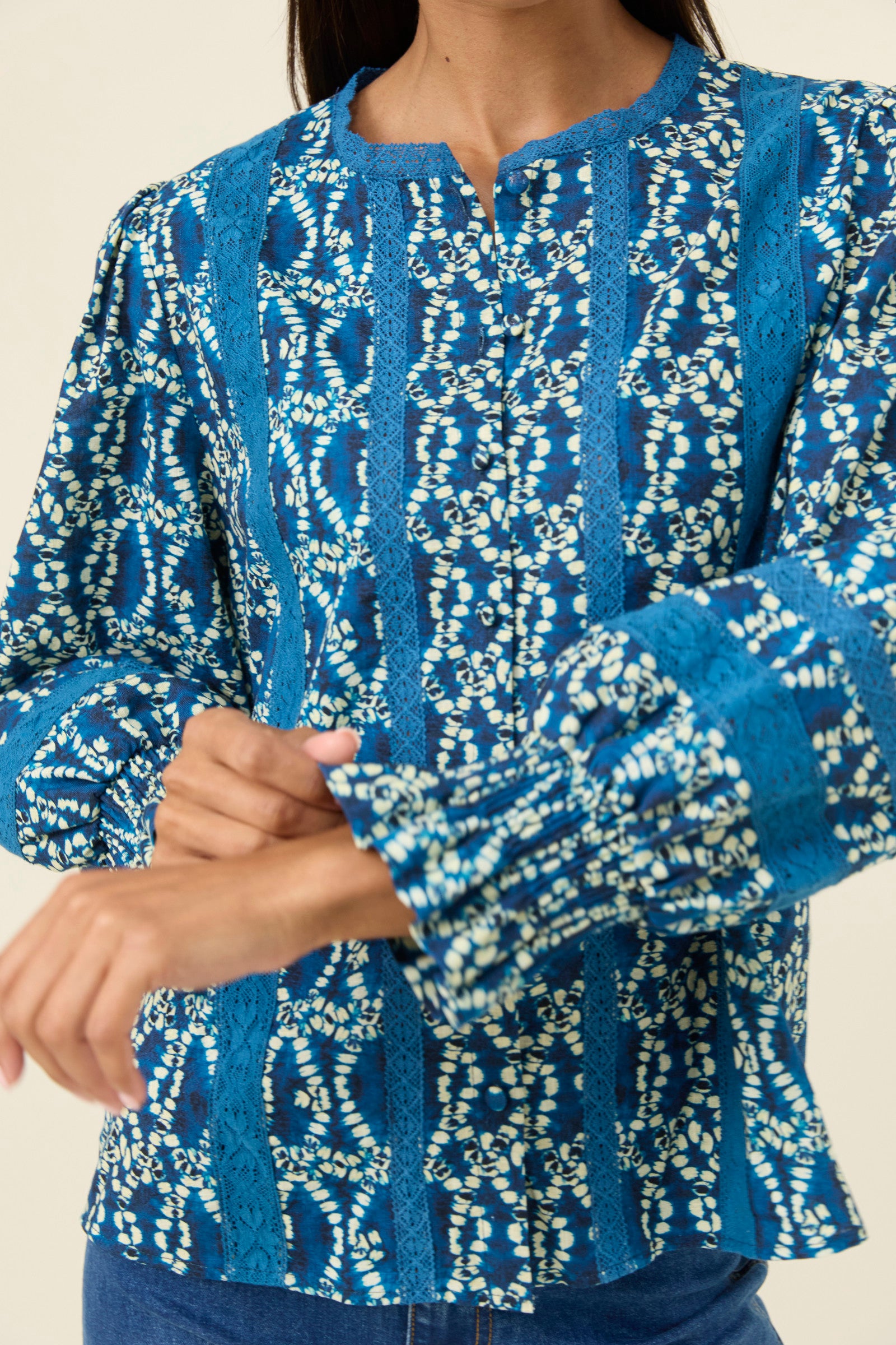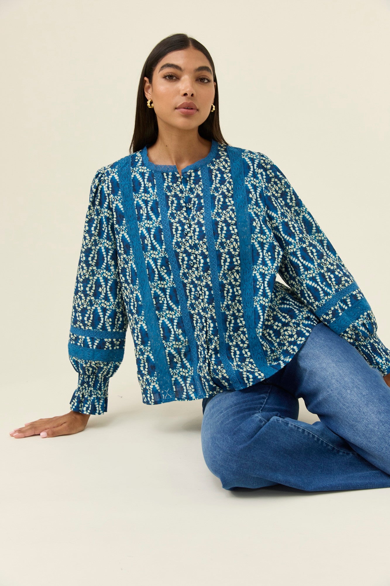 A feminine, lightweight cotton shirt with thoughtful detail, the Maeve Shirt blends soft structure with delicate lace accents. The band collar and lace inserts create a refined texture, complemented by full sleeves that gather at the shirred cuffs for gentle volume.