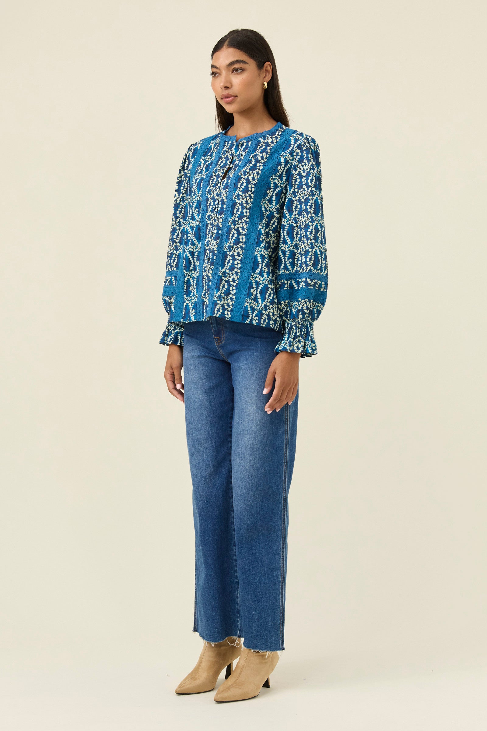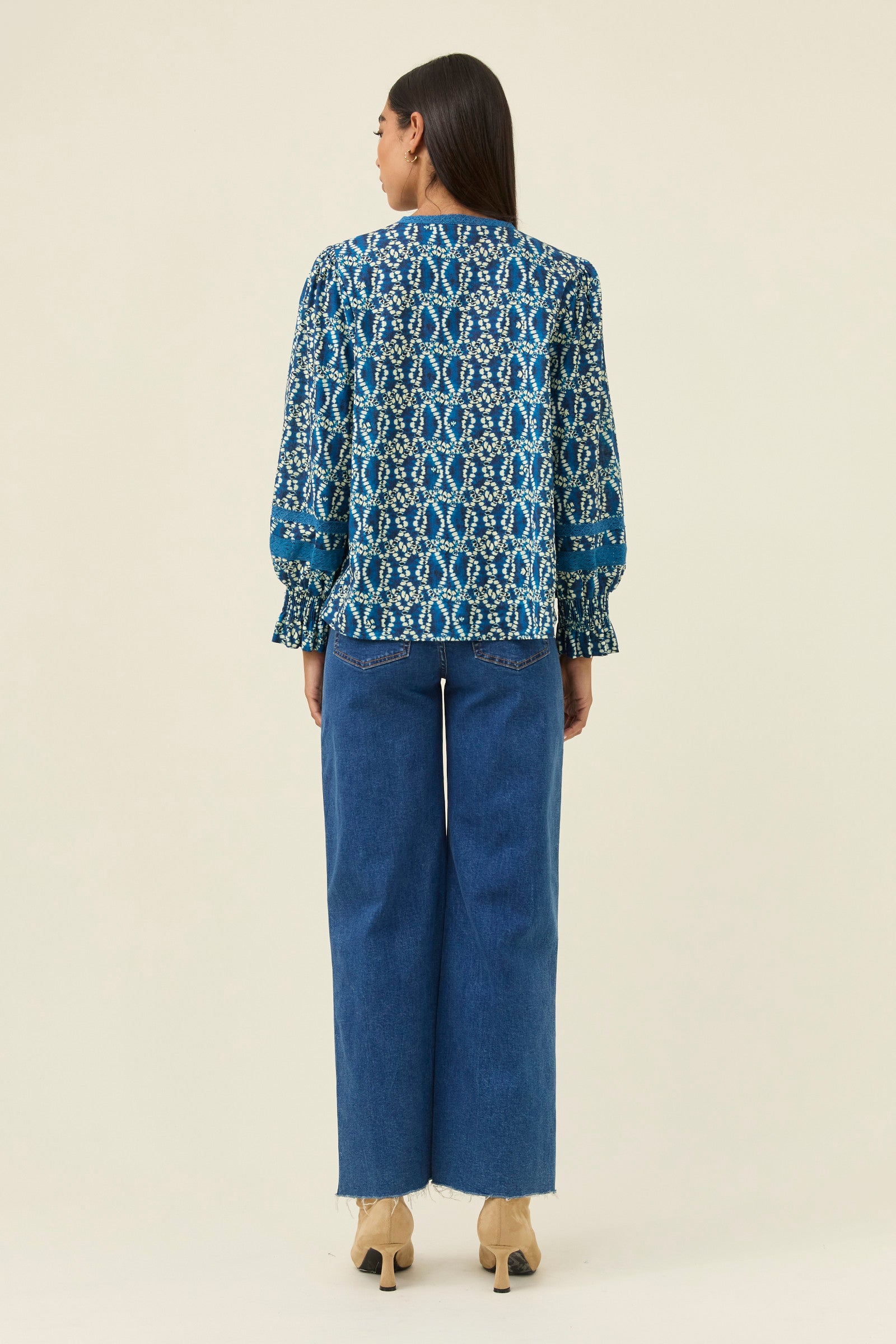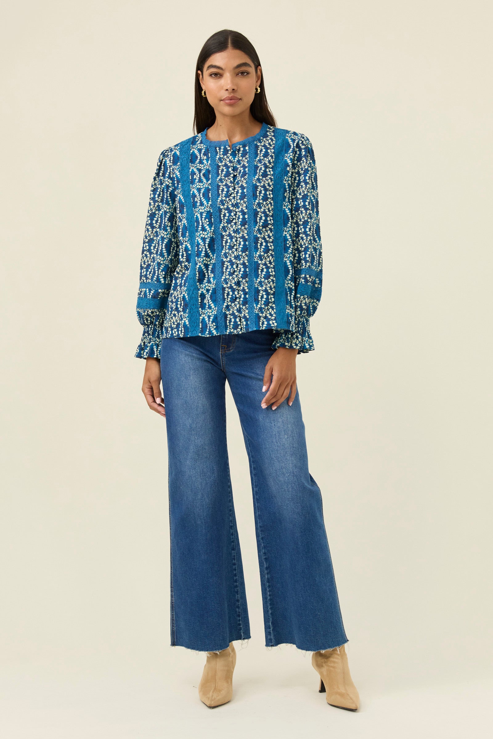 A feminine, lightweight cotton shirt with thoughtful detail, the Maeve Shirt blends soft structure with delicate lace accents. The band collar and lace inserts create a refined texture, complemented by full sleeves that gather at the shirred cuffs for gentle volume.