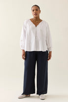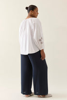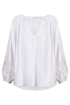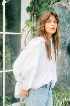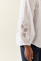 The Nilsa Blouse is a timeless wardrobe favourite. Made from cotton poplin with delicate cutwork embroidery and featuring tie detailing at the neckline. This blouse gives both a flattering shape and elegant coverage.