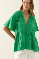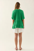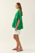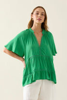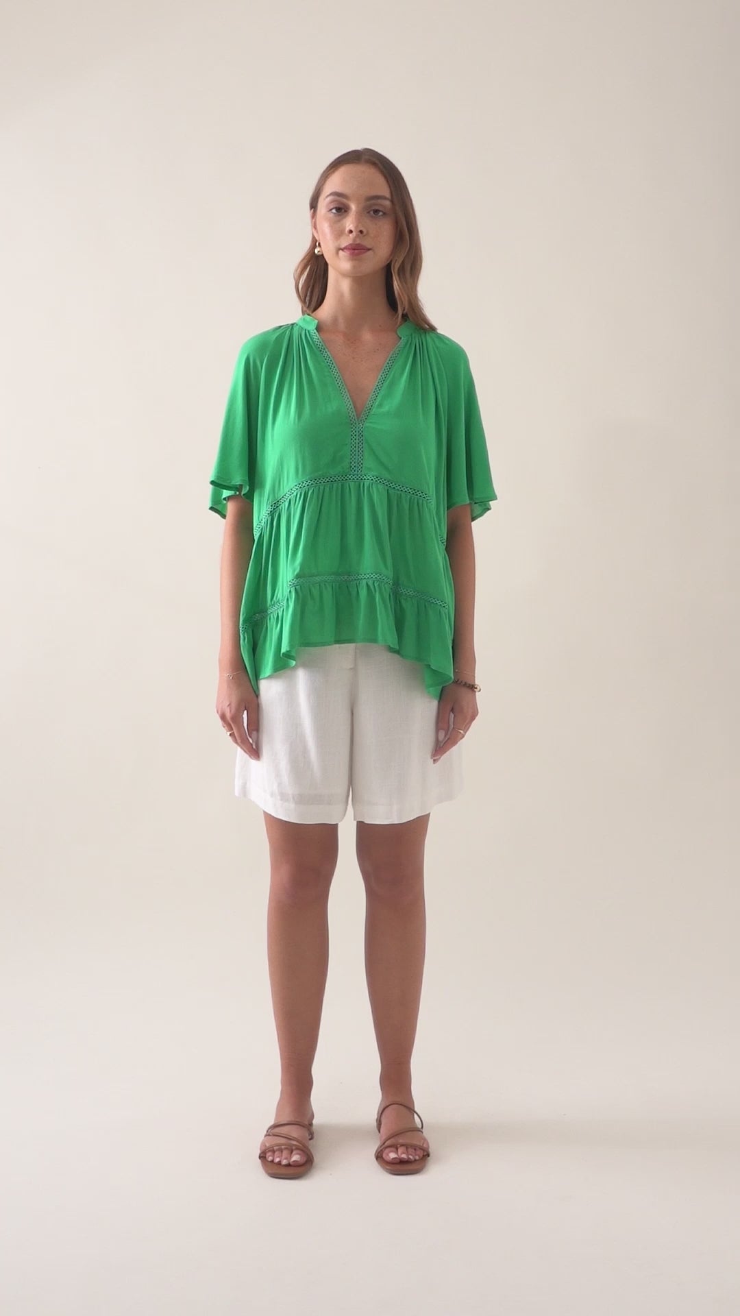 The Oline Top is a flattering style with soft gathering and trim details. Featuring a V-neckline and tiered silhouette, it's a versatile piece that feels relaxed yet put together.