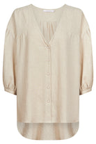 The Venus Relaxed Top combines the beauty of linen with a design that is both stylish and functional. Its V-neck and front placket create a graceful silhouette, while the relaxed fit ensures comfort throughout the day. The elbow-length balloon sleeves and curved high-low hem add a refined detail. Style it with linen pants and slides for a chic, natural ensemble.