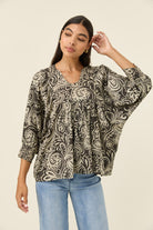 A lightweight cotton voile top with a soft, screen-printed paisley pattern. The front yoke frames the neckline, while the 3/4 sleeves gather into elastic shirred cuffs for gentle volume. Fully lined for comfort, itÕs an airy, relaxed piece for everyday wear. Pair with Scarlett Jean or soften with a flowing skirt for a feminine winter look.