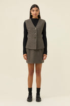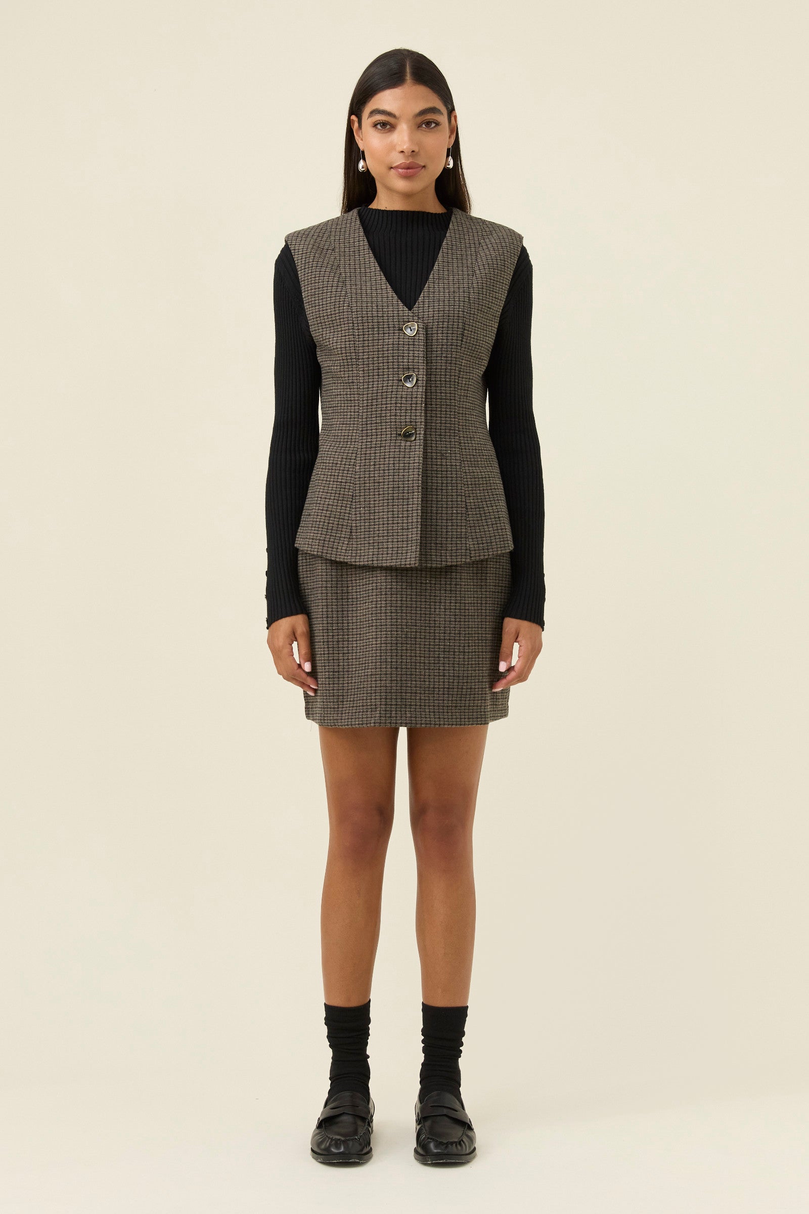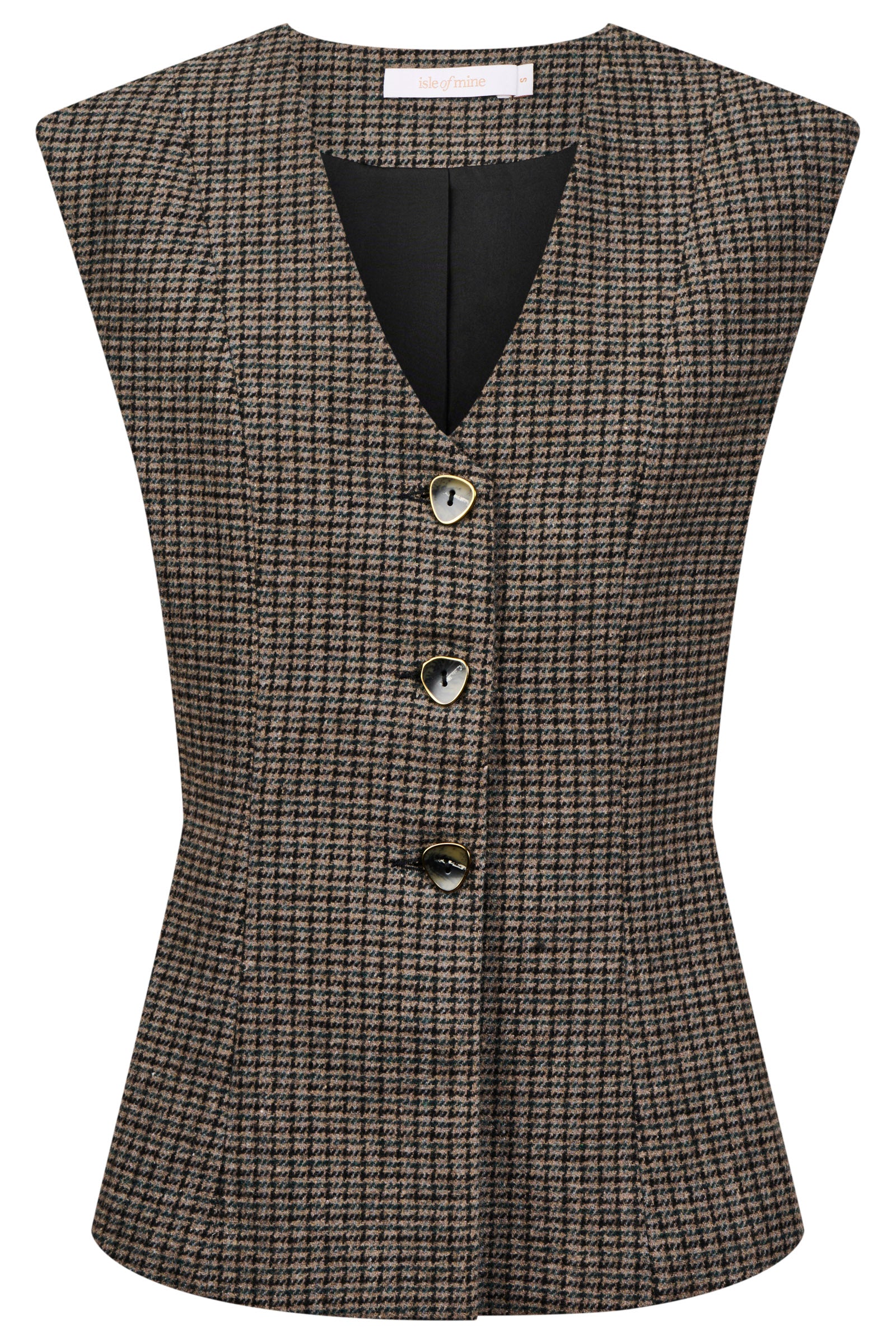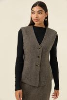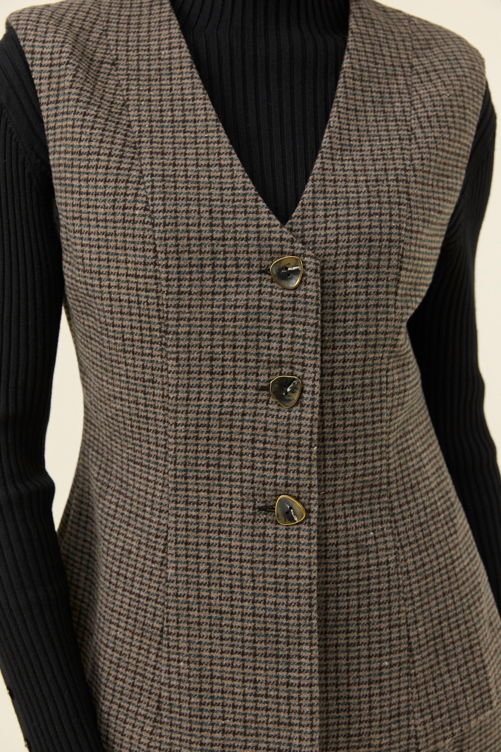 A tailored vest in a softly textured houndstooth suiting fabric, fully lined for a smooth, refined finish. The V-neckline and diamond-shaped buttons add classic detailing, while the panel lines through the body create gentle shaping at the waist.