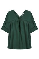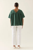 Designed for comfort and movement, the Aurora Relaxed Top features a flattering V-neck at front and back, a dropped sleeve with cuff, and neck ties finished with gold beads. The cotton voile fabric gives it an airy feel.