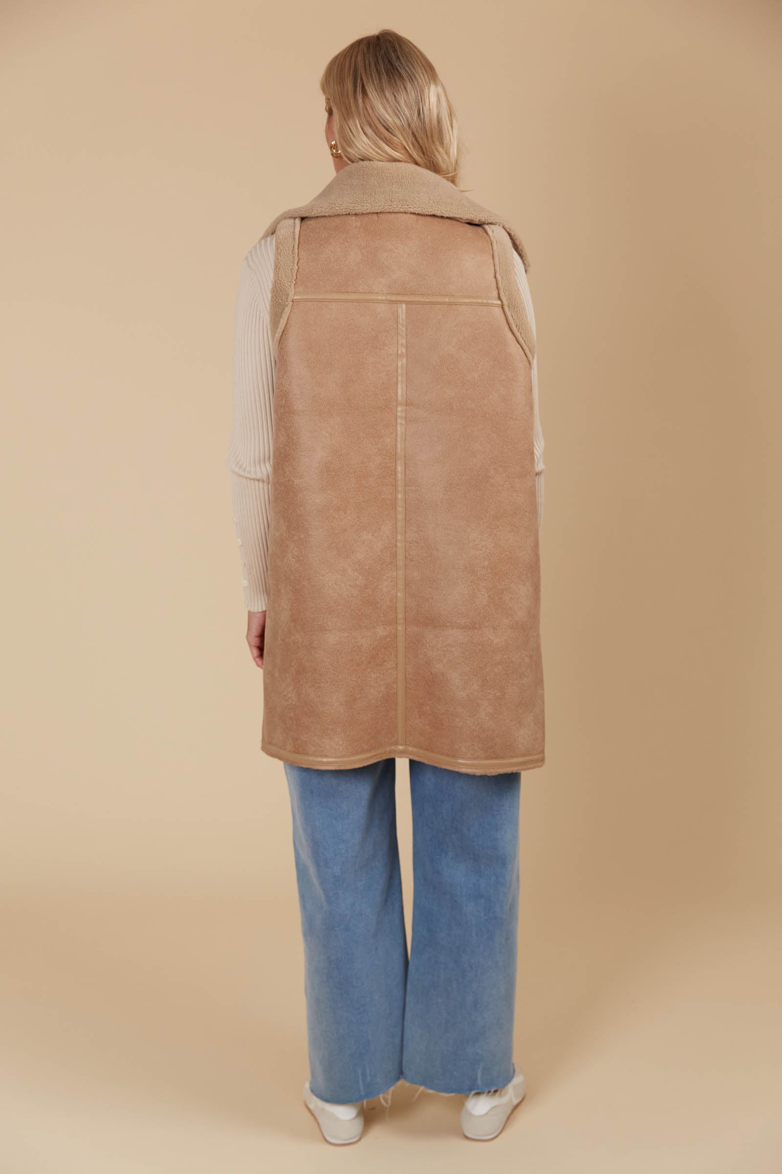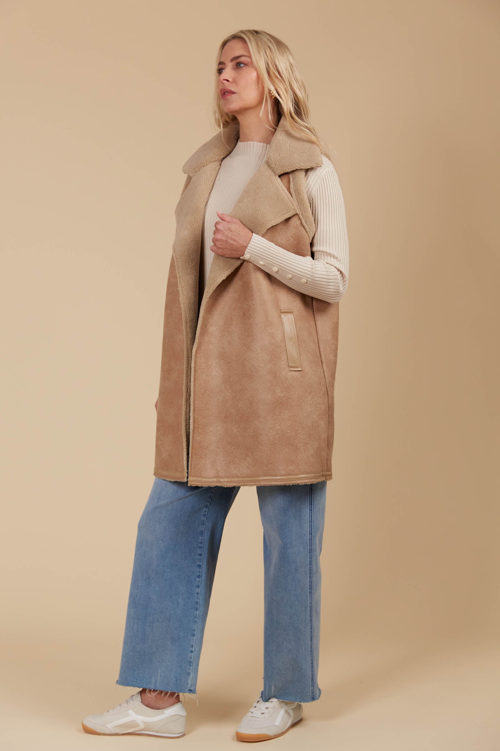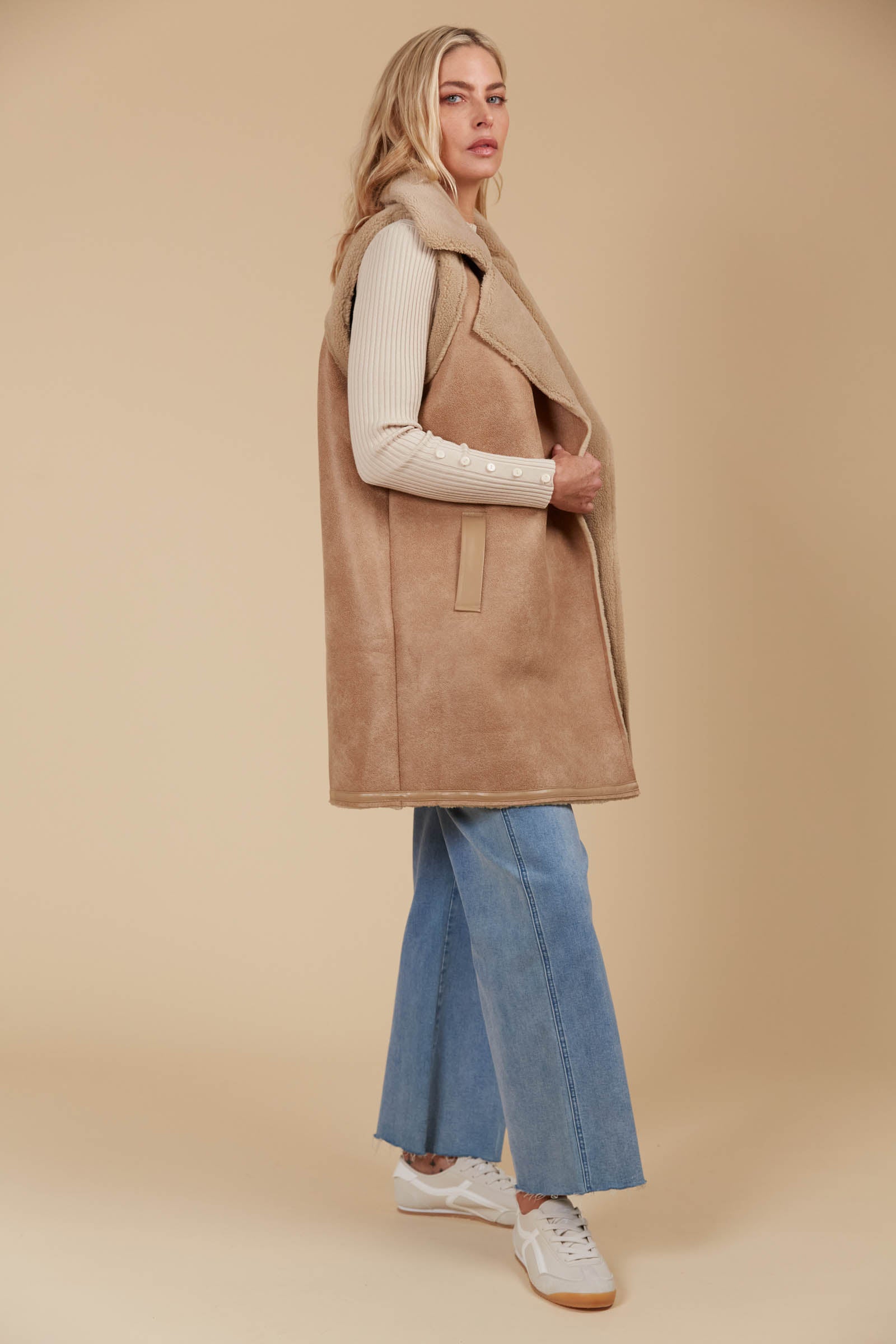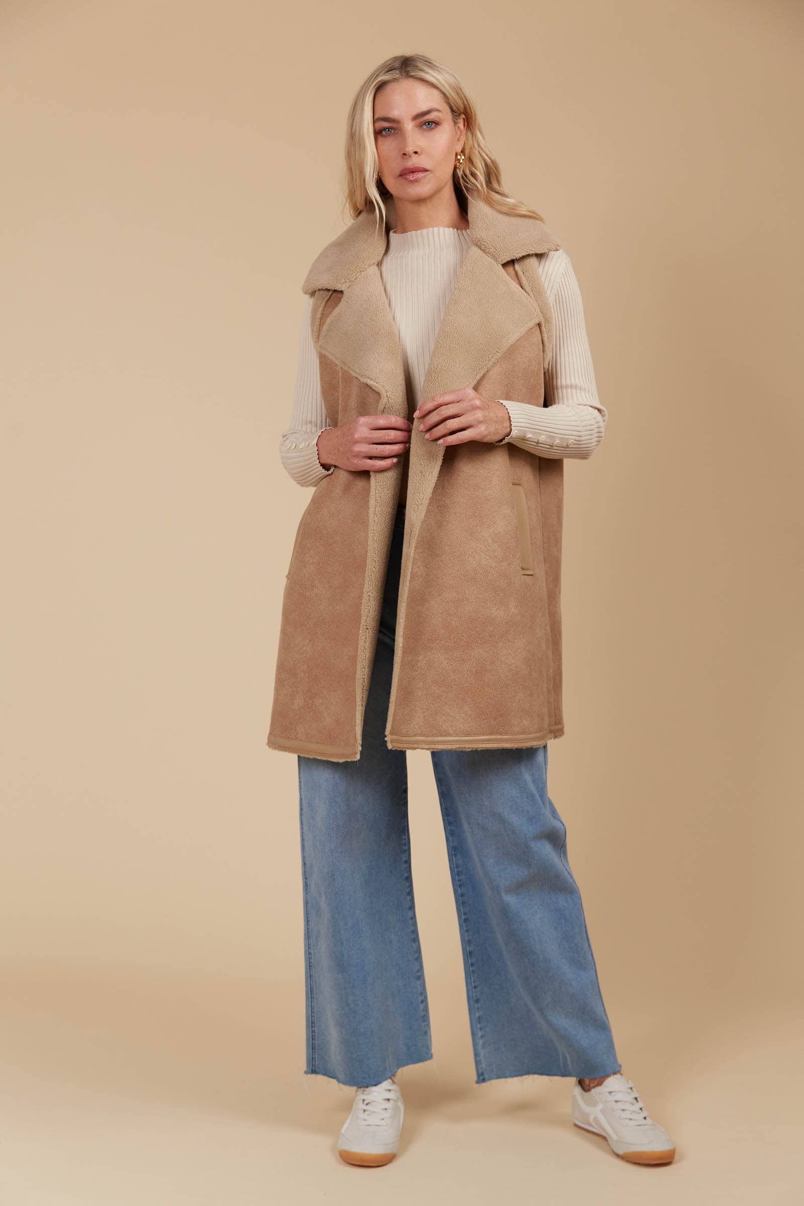 The Eris Vest is the perfect piece for a sophisticated winter outing, offering warmth and style for alfresco brunches, winery weekends, or weekend retreats. The contrast of shearling detailing adds a striking touch to this chic vest, which features a longline silhouette for extra coverage and practical welt pockets. For a sharp and refined ensemble, wear it over a knit top, tailored trousers, and sleek ankle boots.