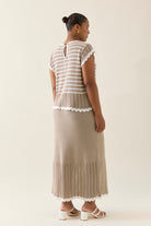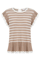 A lightweight knit crafted from 100% cotton with pointelle texture and fine horizontal stripe detail. The relaxed fit features scallop edging at the sleeves, hem, and neckline, finished with a back keyhole and tie detail.