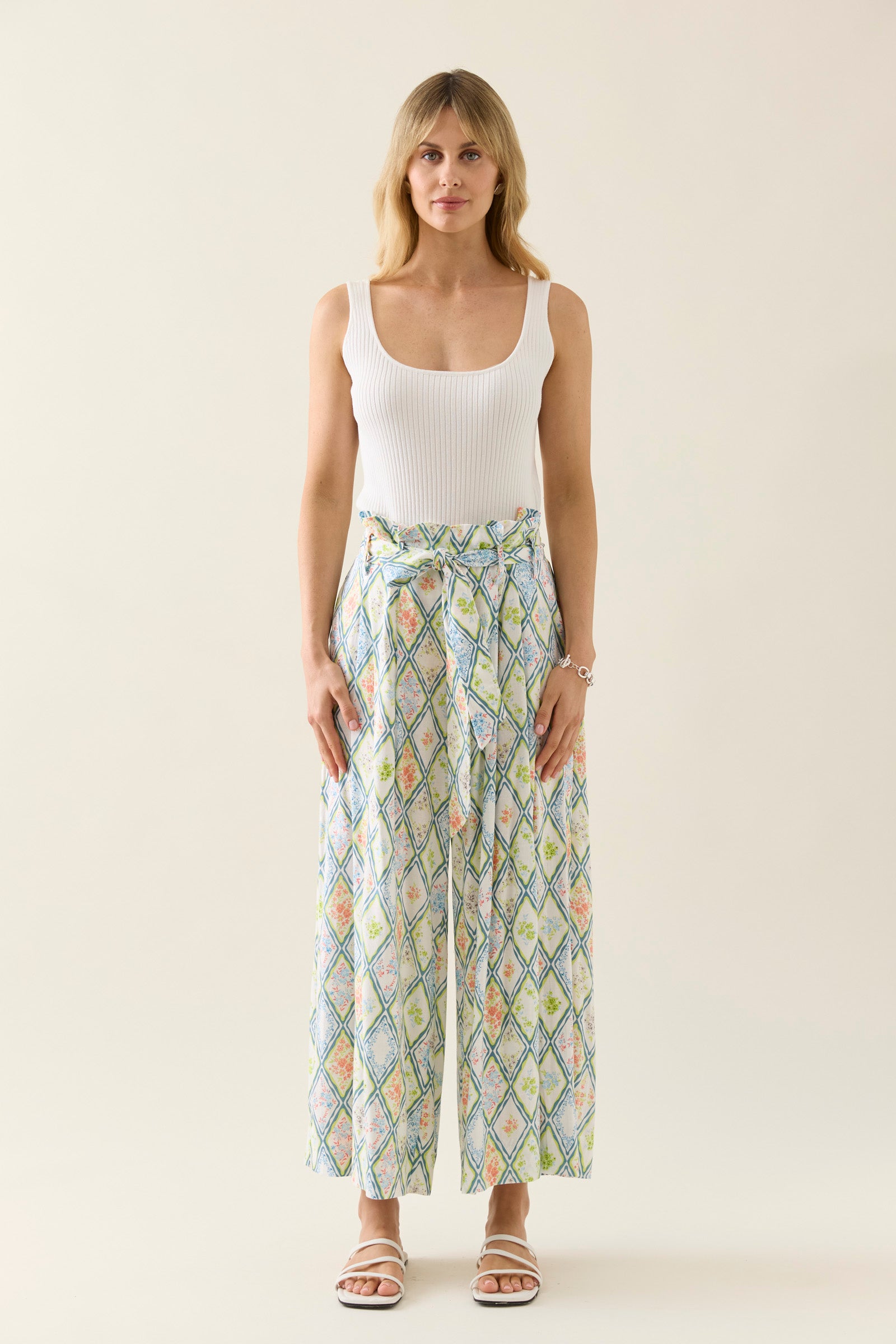 A softly structured cropped pant in a breathable linen blend. Designed with a high paperbag waist, wide leg, and self-fabric belt. Four front pleats create shape, while the elasticated back waistband ensures a comfortable fit. Available in an exclusive Tile colourway.