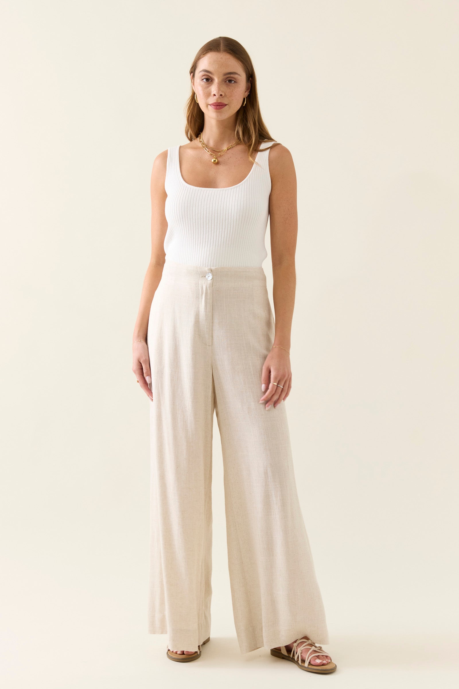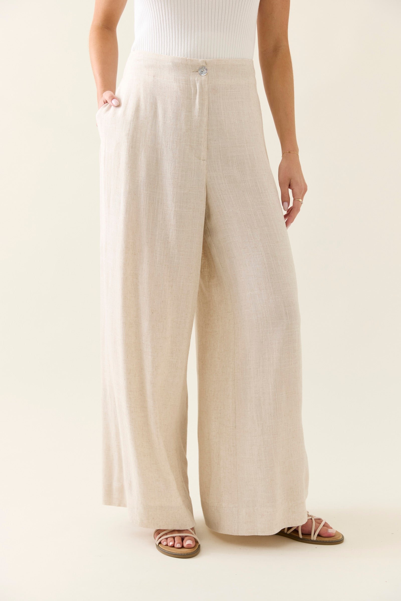 A timeless summer staple, the Ingrid Pant is crafted in a breathable linen blend with a full-length, wide-leg silhouette. The high waist features a fly front with a shell button and internal hook and bar closure.