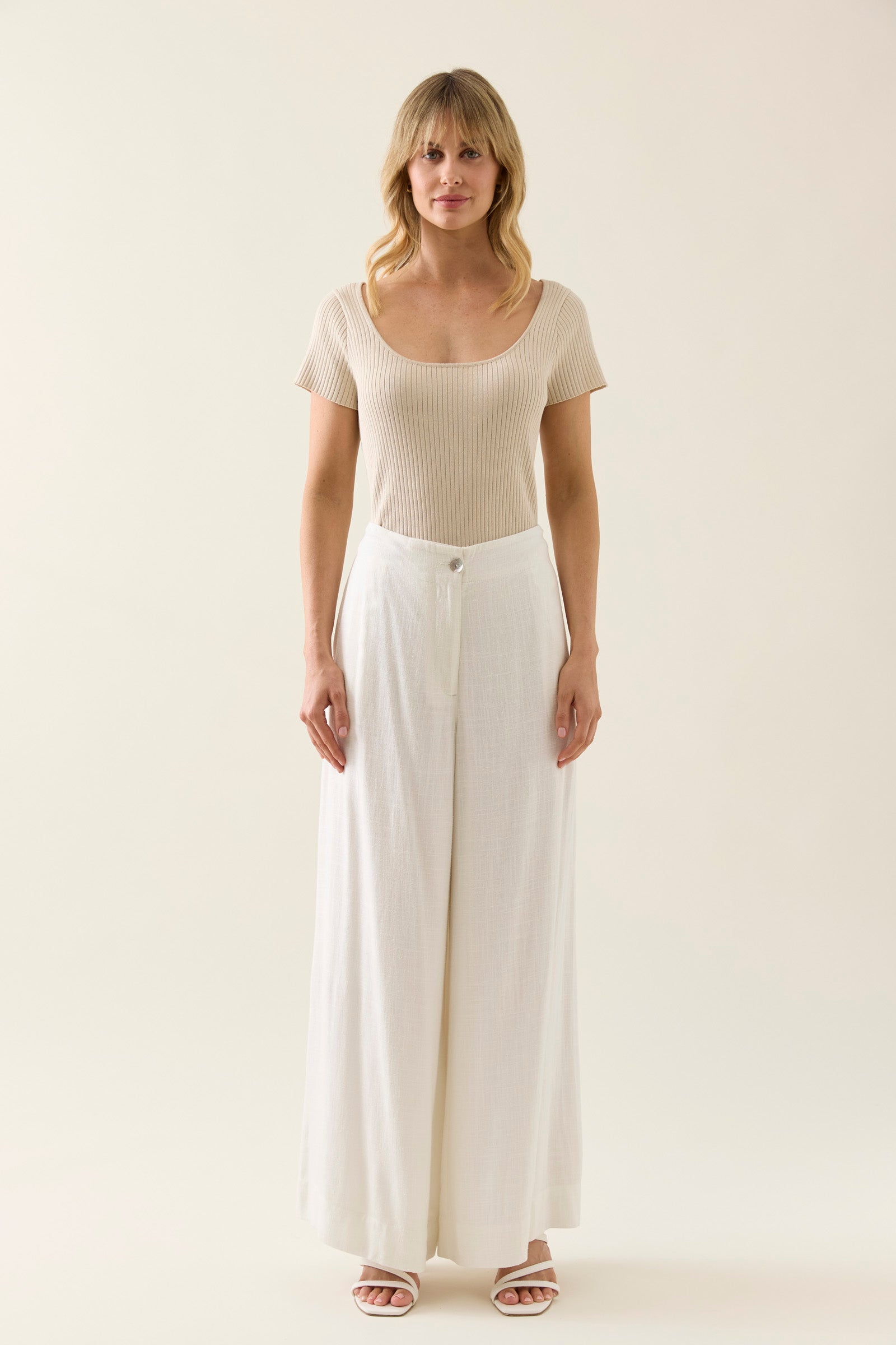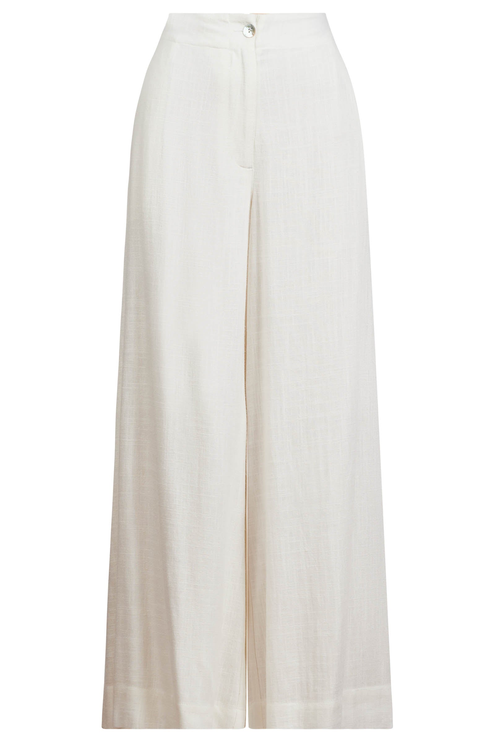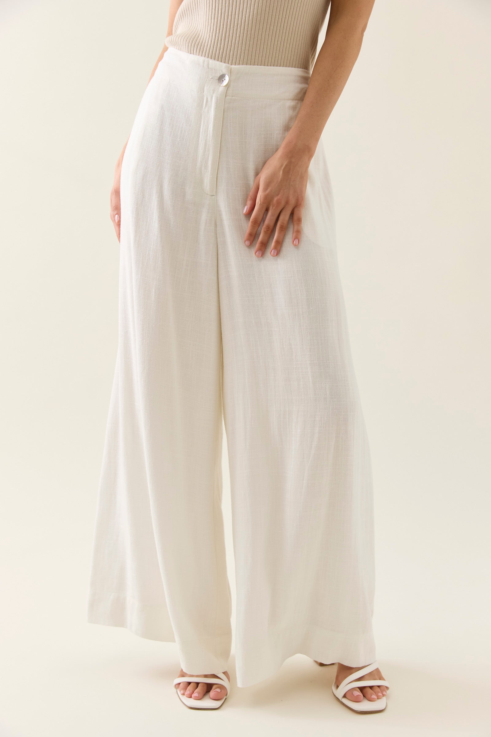A timeless summer staple, the Ingrid Pant is crafted in a breathable linen blend with a full-length, wide-leg silhouette. The high waist features a fly front with a shell button and internal hook and bar closure.