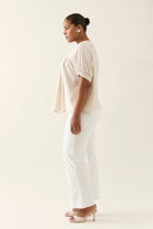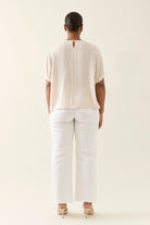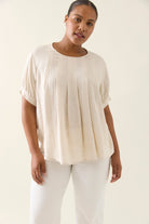 A relaxed linen-blend top with soft front pleats that bring subtle texture to the neckline. Finished with a round neck, keyhole button closure at the back, and cuffed short sleeves for laid-back comfort.