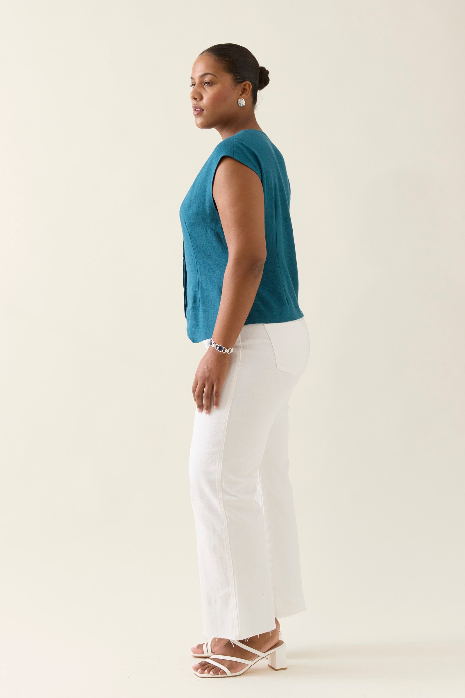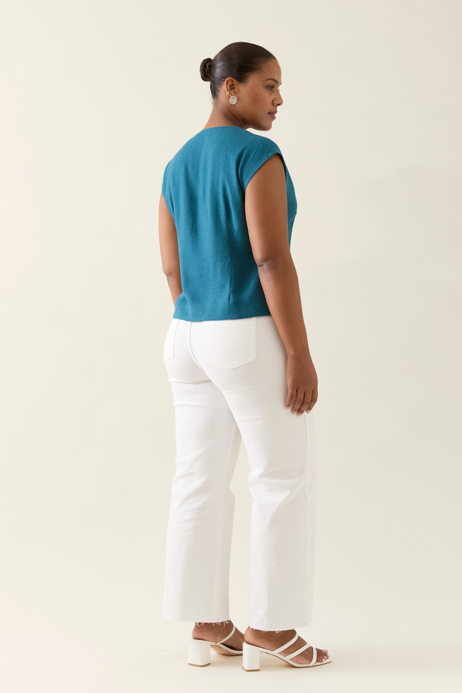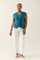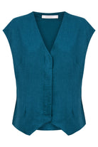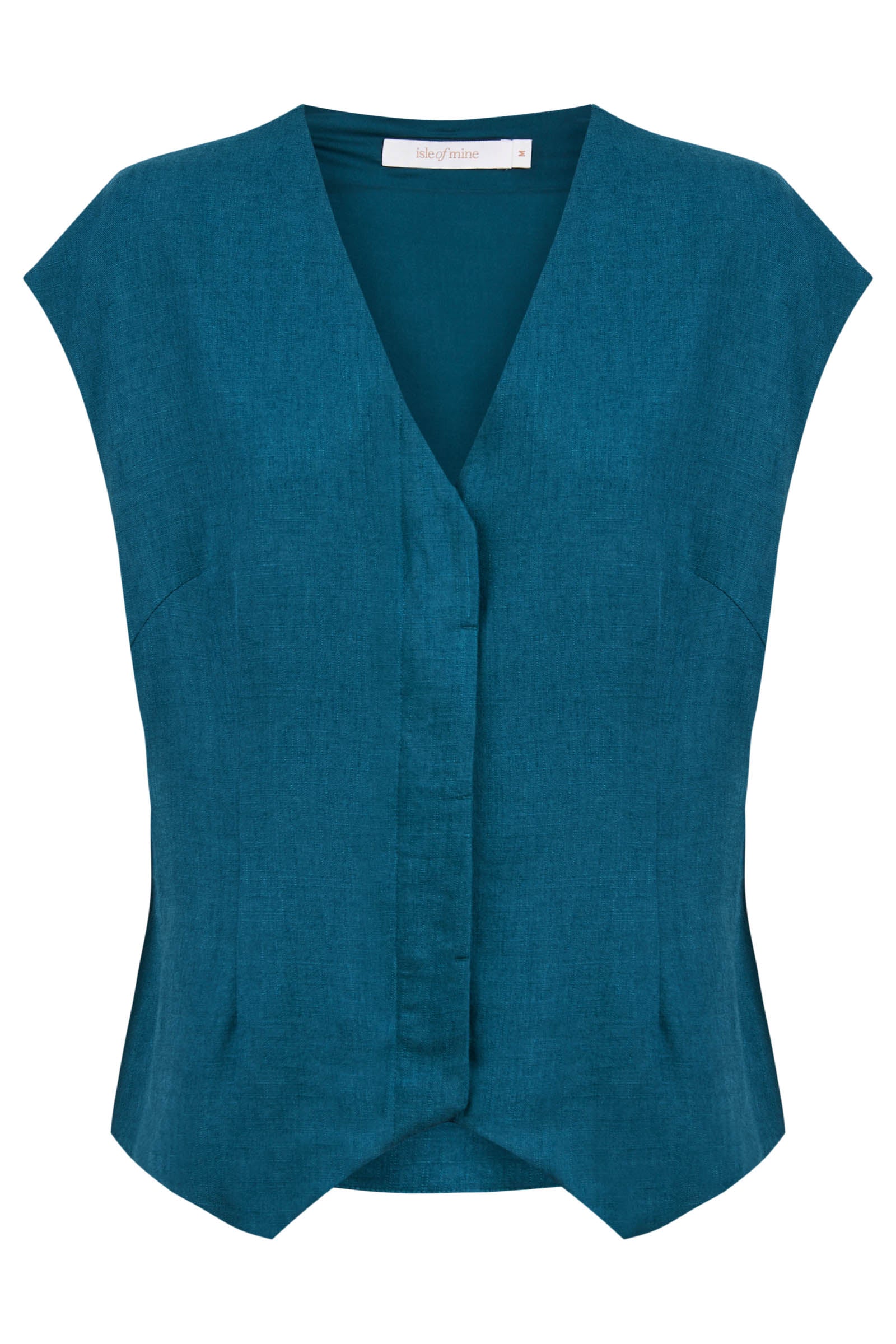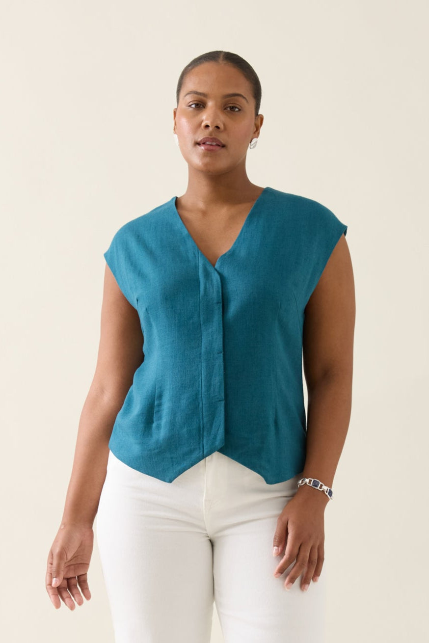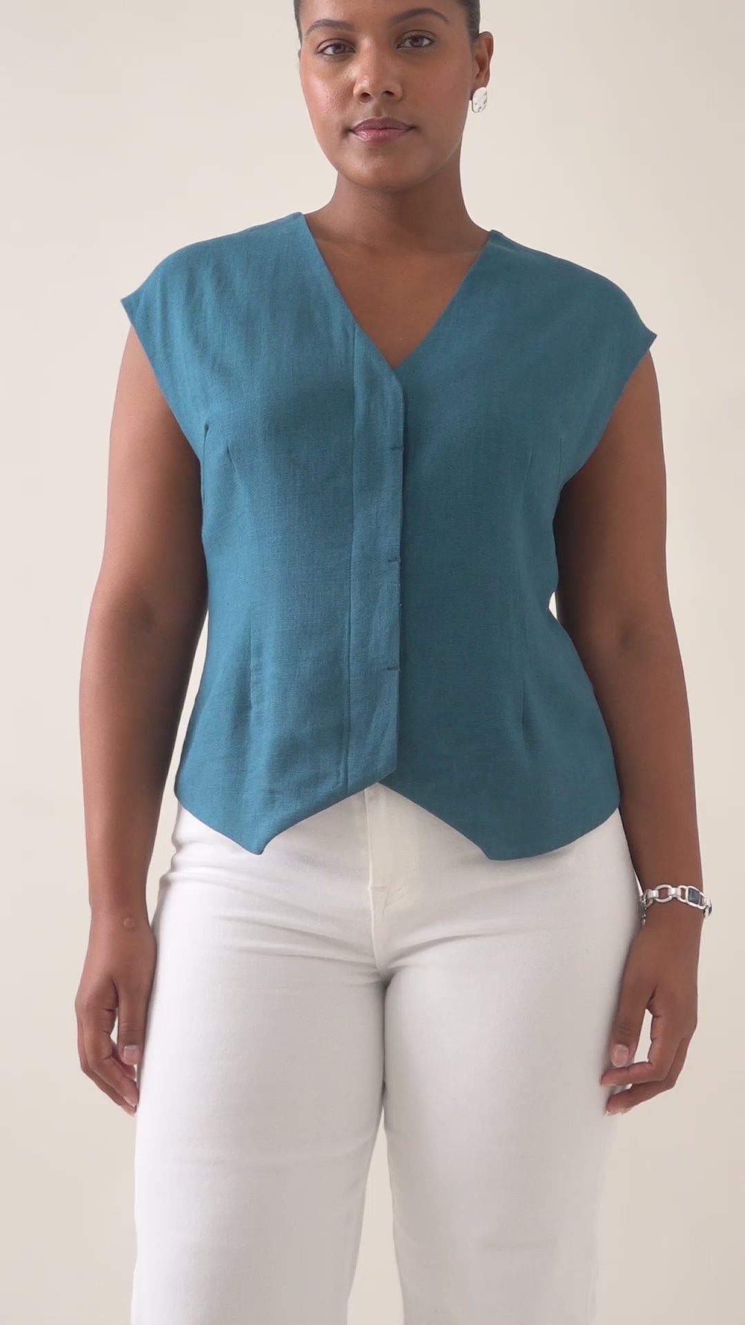 A tailored linen-blend vest designed with subtle panelling for soft shaping through the waist. Fully lined for comfort and structure, with a clean hidden button placket and wide sleeves that provide relaxed coverage.